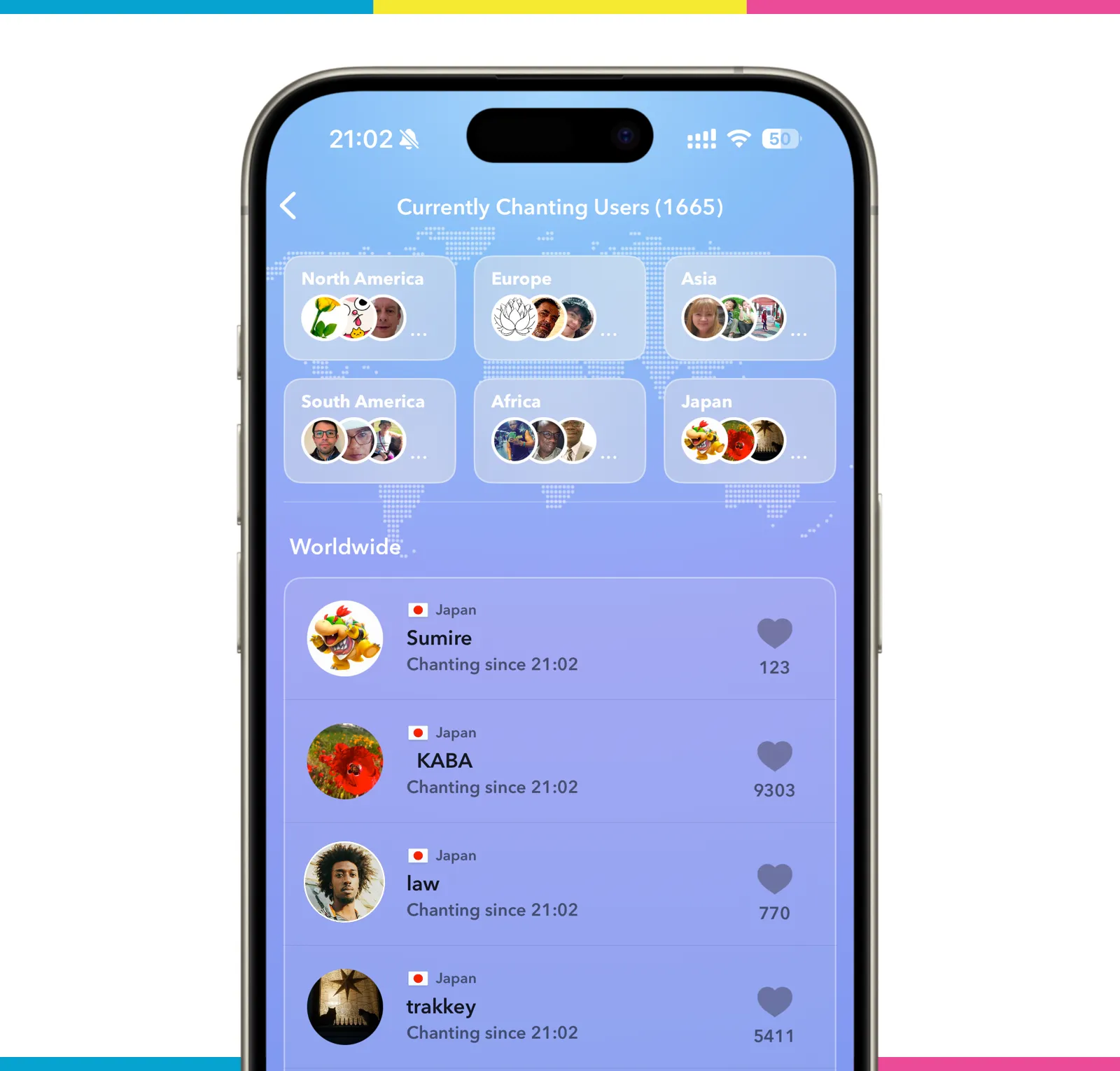 At the top of the screen, you will see icons of users who are currently chanting by continent. By tapping each of these icons, you can view a list of users by continent. Tap again while a continent is selected, and the list will return to the global view.