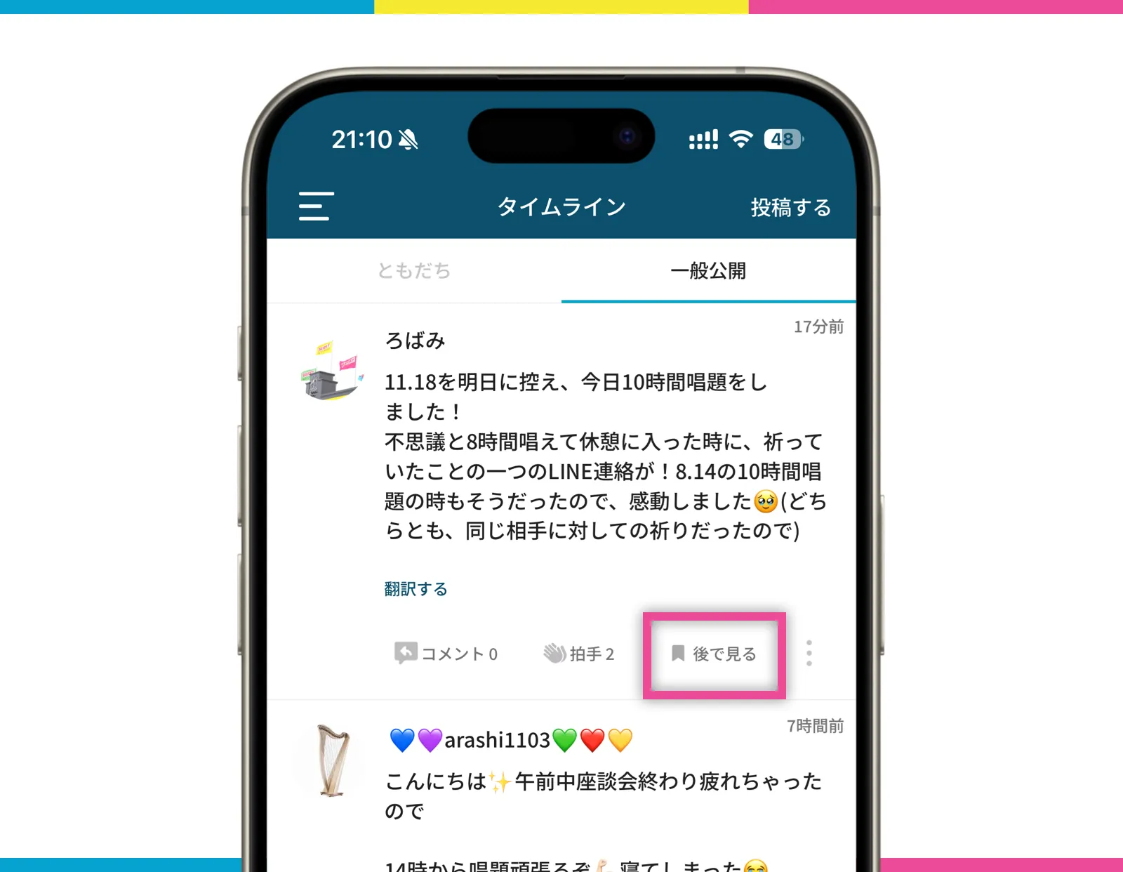 こちらは、タイムラインで「この投稿いいな」、「後でまた読み返したいな」という投稿を保存しておくことが出来る機能です。